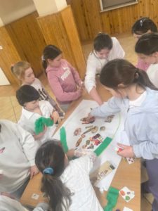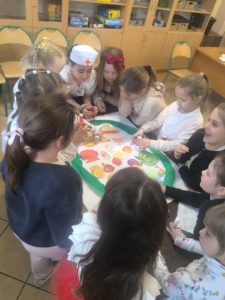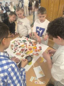 na konieczność picia wody oraz ograniczania spożycia słodyczy. Uczniowie chętnie zadawali pytania, dzielili się swoimi doświadczeniami oraz z dużym zaangażowaniem rozwiązywali krzyżówkę, zagadki oraz zaprezentowali przygotowane hasła o zdrowiu. Na Dniu Zdrowia nie zabrakło również aktywności plastycznej. Uczniowie pracując w grupach wykonali piękne Talerze zdrowia, przedstawiające zdrowe produkty, które należy wykorzystywać